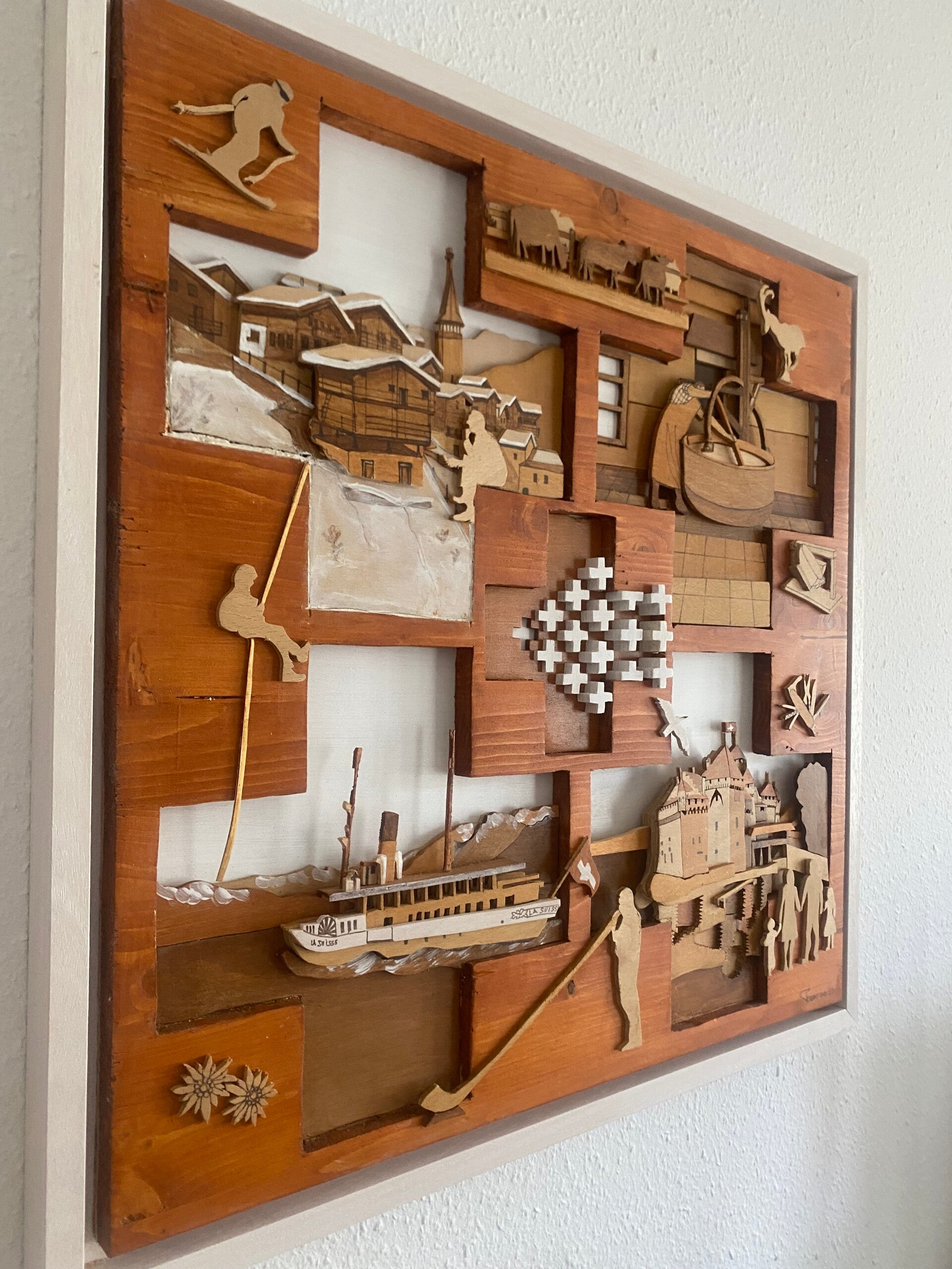 Détail: 4 tableaux intégrés dans ce travail, Grimentz, une fromagerie du pays d'en haut , le lac Léman et l bateau "la Suisse", le château de Chillon