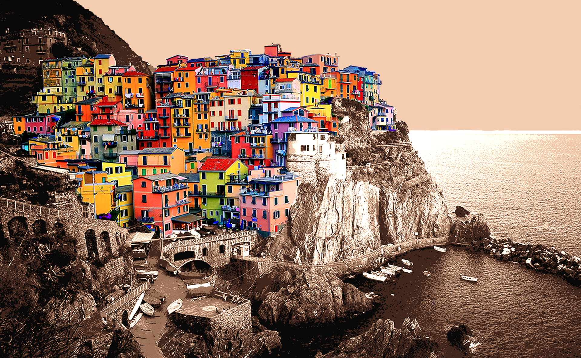 Présentation des cinque Terre. tableau en bois peint en couleur pour les maisons typiquement coloriées de l'Italie
